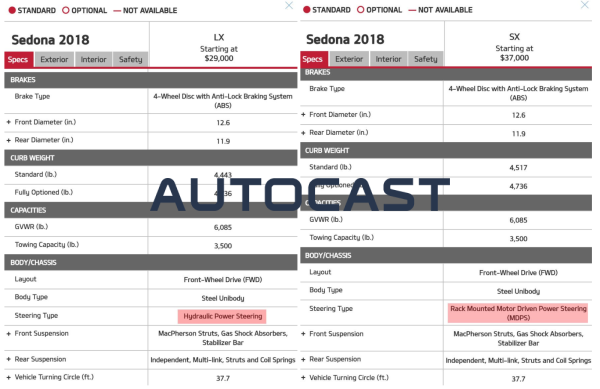 가운데 북미에서 판매되는 모델(현지명세도나) 국내 모델의 MDPS(전동식 파워 스티어링 시스템장착 여부로 내수 차별 논란을 빚고 있다기아차 홈페이지에 따르면 국내 모델은 기존의 유압식 스티어링시스템을 그대로 유지한 반면 북미 모델은 MDPS 장착하고 있다.