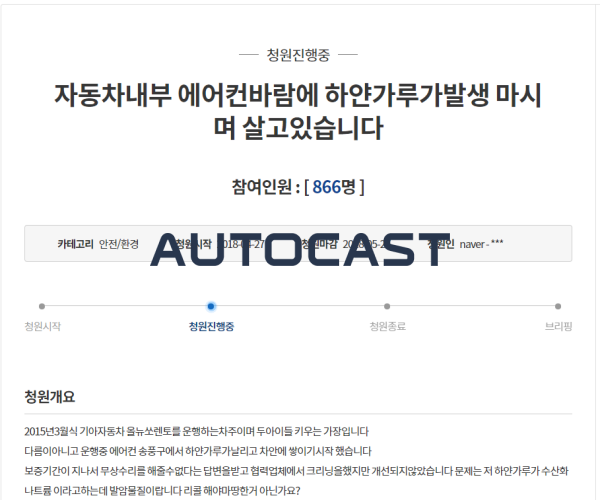 기아자동차의 일부 차종에서 에어컨을 작동할 경우 송풍구를 통해 흰색의 가루가 쏟아져 나와 쌓이는 증상에 대해 국민청원이 시작됐다. 지난달 27일 시작한 국민청원에는 약 800여 명이 참여했으며 이들은 해당 차종의 동호회 등을 통해 꾸준히 문제가 제기했지만 해결이 되지 않고 있다고 주장했다.