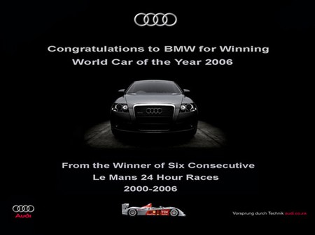 이에 아우디 역시 포스터 광고를 통해 답했다. “2006년 세계 올해의 차에 선정된 BMW 축하드립니다. 르망 24시 경주에서 2000~2006년 6연속 우승한 아우디로부터” BMW가 올해의 차로 선정된 것을 비꼬는 것과 동시에 대회 6연승을 자랑하는 의미의 메시지를 전달하기도 했다.
