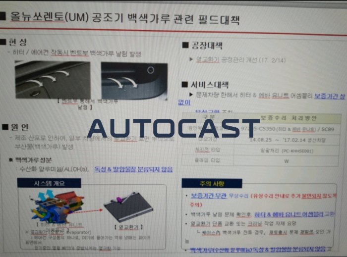 일명 ‘에바가루’는 에어컨의 증발기(에바포레이터)의 알루미늄 표면처리 공정 불량으로 발생하는 것으로 추정됐다. 부식된 알루미늄에서 나온 흰색 가루가 에어컨을 강하게 켤 경우 송풍구를 통해 자동차 실내로 나오는 문제다. 기아자동차의 쏘렌토, 스포티지 등 일부 차종 동호회에서는 지난해부터 이같은 문제에 대해 지속적인 공론화를 시도했다. 해당 동호회에는 동영상이나 사진으로 일명 ‘에바가루’가 나온 모습이 등장하며 동일 차종을 운행하는 소비자를 통해 사례를 모았고 언론과 청와대 신문고 등을 통해 알려지면서 공론화됐다.