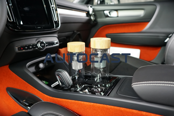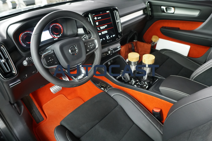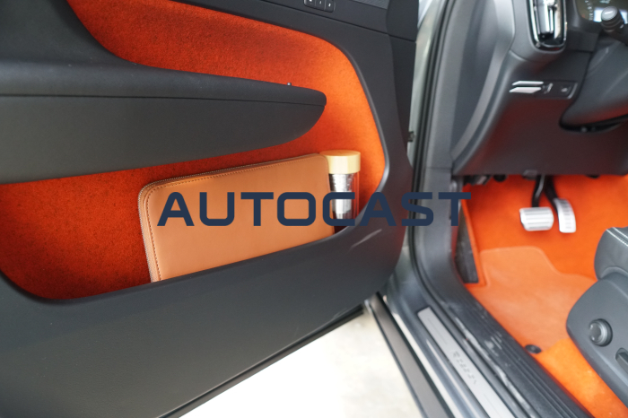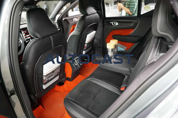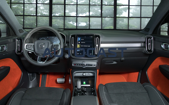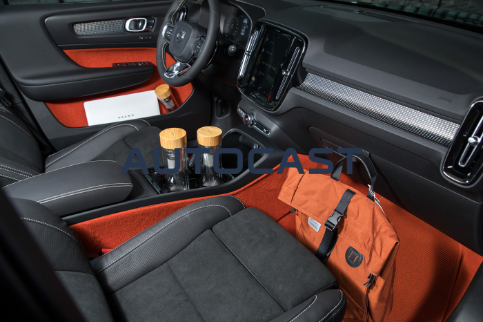 실내를 구성하는 소재는 호불호가 갈릴 것으로 보인다. XC60이나 XC90에서 봤던 고급스러운 가죽과 우드 패널을 기대했다간 당황할 수 있다. 이날 시승한 R-디자인 트림에는 오렌지색의 펠트(털이나 수모섬유를 수분과 열을 주면서 두드리거나 비비거나 하는 공정을 거쳐 시트모양으로 압축된 원단)를 도어 트림, 바닥 등 곳곳에 사용했다. 100% 재활용이 가능한 소재라 친환경적이라는 점은 좋지만, 살에 닿았을 때 느껴지는 꺼끌꺼끌함은 다소 낯설다.