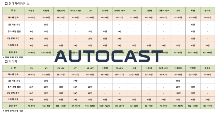 현대차는 차종 별로 21만 원에서 최대 87만 원까지, 제네시스는 69만 원에서 288만 원까지, 기아차는 29만원에서 171만 원까지 소비자 가격이 낮아진다. 이와 함께 현대·기아차는 7년 이상 경과 노후 차량 교체시 30만 원을 지원하기로 결정했다.