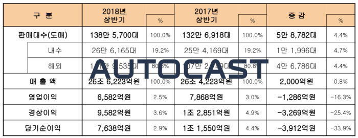 기아차는 서울 양재동 기아자동차 본사에서 2018 상반기 컨퍼런스콜을 갖고 ▲매출액 26조 6,223억 원 ▲영업이익 6,582억 원 ▲경상이익 9,582억 원 ▲당기순이익 7,638억 원 등으로 집계됐다고 27일 밝혔다.