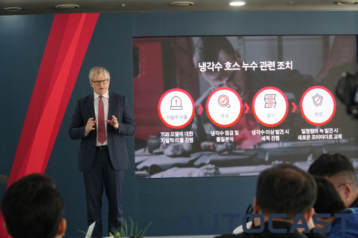 이어 얀 비트 A/S 총괄・한국 시장 총괄 수석 부사장은 제품 이슈와 관련해 향후 대책을 밝혔다. “먼저 문제가 발견된 TGS 덤프 트럭 자발적 리콜을 실시 중이다. 냉각수 상태를 분석하고 이상이 있으면 세척 작업을 실시한다. 또 녹 발생 시 새로운 프리타더로 교체할 계획이다. 아울러 프리타더 보증 기간 연장 3년에서 5년으로 연장한다고 말했다. 이와 함께 디스플레이 오류와 관련해서는 프로그램 업데이트 진행해 나갈 예정이다라고 밝혔다.