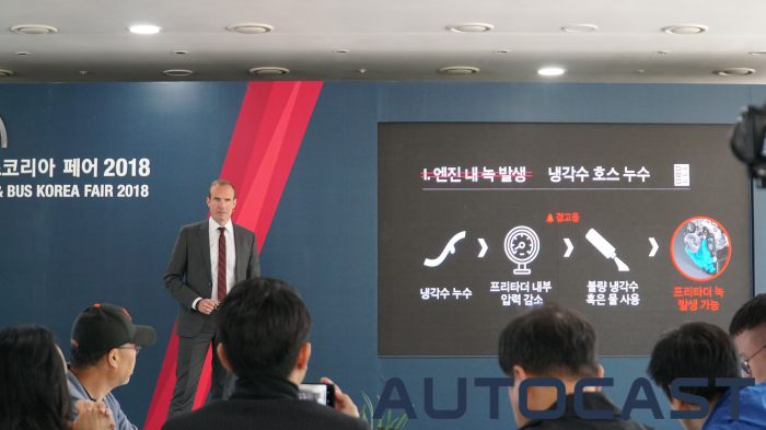 이어 엔진 내부 녹 발생과 관련한 이슈에 대해 “철저한 조사 결과, 엔진 내에서 발생하는 녹이 아니다. 해당 문제는 엔진 내 녹 발생이 아닌 냉각수 호스 누수로 인한 것으로 호스가 마모되면서 냉각수 누수가 발생하면 프리타더(보조 브레이크) 내부 압력이 감소, 이 때 불량 냉각수나 물을 사용하면 프리타더의 녹이 발생할 수 있다고 말했다.