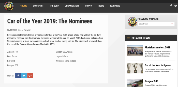 모터쇼 언론공개행사 전 날에는 ‘유럽 올해의 차’도 선정한다. 유럽 내 23개국에서 활동하는 자동차 저널리스트 60인이 올해의 차 최종 후보 7대를 심사한다. 이번 후보는 기아차 씨드, 포드 포커스, 메르세데스 벤츠 A클래스, 푸조 508, 시트로엥 C5 에어크로스, 재규어I-Pace, 알파인 A110이다.