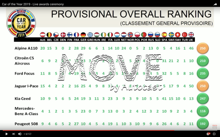 올해 유럽 올해의 차에는 르노 계열의 알파인(Alpine) A110과 시트로엥 CS 에어크로스, 포드 포커스, 재규어 I-PACE, 기아 씨드, 벤츠 A 클래스, 푸조 508이 경쟁했다.