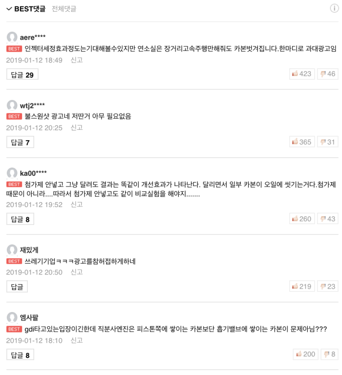 댓글을 통해 역시 그 효과에 대한 의문을 제기하는 사람이 많았다. ‘인젝터 세정 효과 정도는 기대해볼 수 있지만 연소실은 장거리 고속주행만 해줘도 카본이 벗겨진다’, ‘첨가제 안 넣고 달려도 결과는 똑같이 개선 효과는 나타난다’, ‘아반떼 40만키로 운행 중인데 세정제 불필요하다’, ‘넣어도 안 넣어도 차이 못 느낀다. 차라리 운전 습관을 바꾸는 게 낫다’, ’‘보약 개념이지 체감 효과보다는 심리적 안정감’ 등 회의적인 댓글이 많았다. 오토캐스트의 실험은 규모의 한계와 비교군의 부재 등의 아쉬움을 남기고 다음을 기약했다.