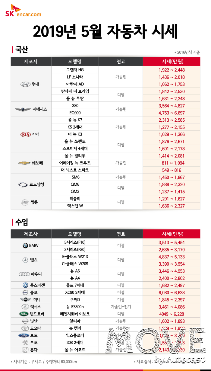 SK엔카닷컴의 5월 첫 주 자동차 시세에 따르면 주요 인기 차량 가격의 전월 대비 평균 약 1.37% 상승했다. 특히 SUV의 시세 상승이 두드러졌다.