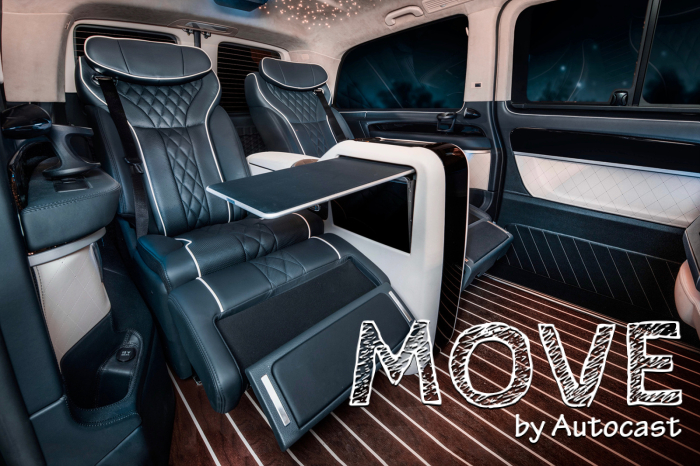 승객석의 양쪽 문은 모두 전자동 슬라이딩 도어다. 승객석 모두에는 통풍, 열선, 안마 시트는 물론 전 자동 레그 서포트와 테이블을 장착했다. 시트 양쪽에는 포칼 스피커를 장착하고 중앙 콘솔에서 조정 가능한 최고급 알파인 앰프를 탑재했다. 천장은 스타라이트 조명을 시공해 고급감을 더했다. RGB 컬러의 실내 무드등은 취향에 따라 다르게 연출 가능하다. 이 밖에도 아이퓨리 공기청정기와 미니 냉장고도 제공한다.