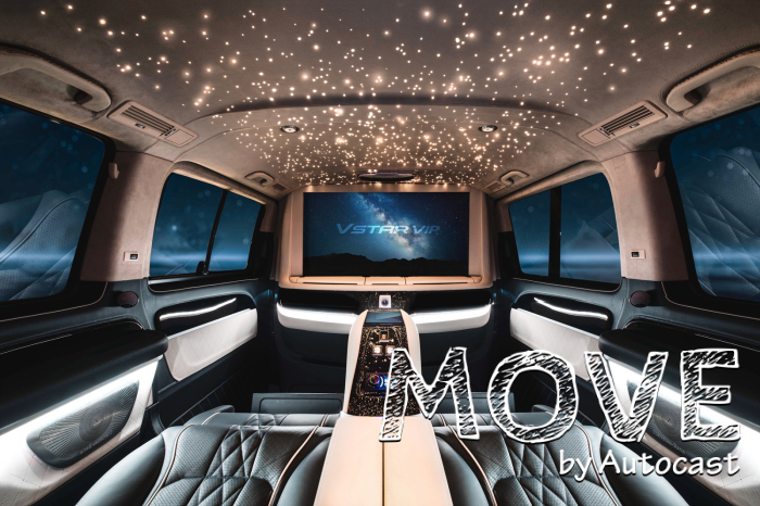 브이스타 VIP는 운전석과 승객석 사이에 전자동으로 열고 닫을 수 있는 프라이빗 파티션을 설치해 프라이버시를 보호하도록 했다. 또 이동 시 휴식과 업무처리를 위해 승객석 공간 구성을 재설계하고, 최첨단 멀티미디어 및 편의사양을 대거 탑재했다.