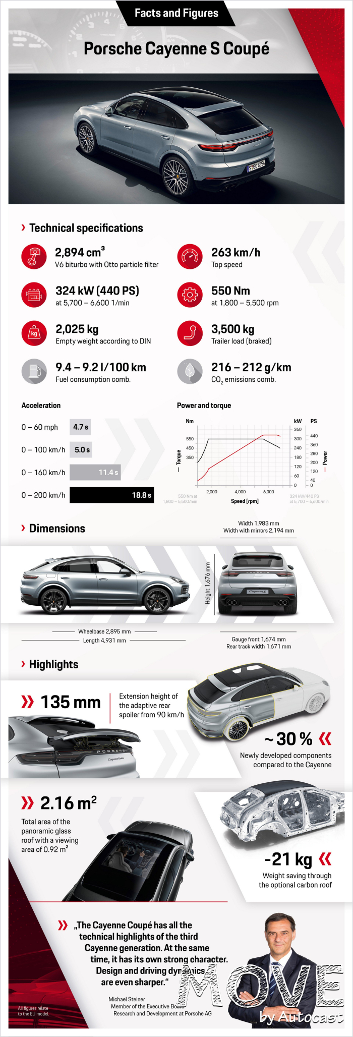 스탠다드형 모델과 터보 모델 사이에 자리잡는 2020 카이엔 S 쿠페로 트윈터보 2.9리터 V6 엔진을 탑재한다. 최고출력 434마력을 내뿜으며 최대토크 56.1kg.m를 발휘한다. 엔진은 8단 자동 변속기와 짝을 이루며 기본 사양으로 적용되는 올-휠 드라이브 시스템에 동력을 전달한다. 제로백은 5.0초에 달하며 최고속도는 263km/h에 달한다.