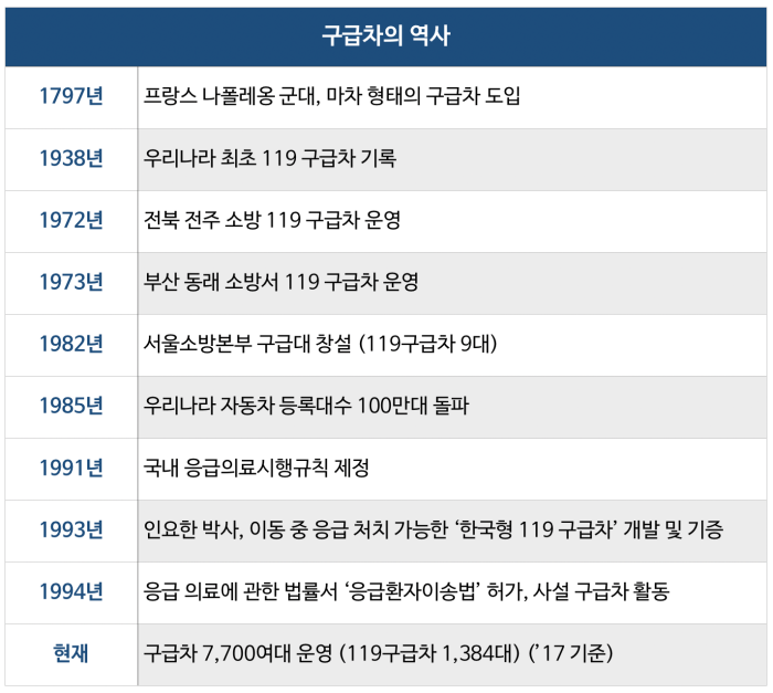 편집자주/ 자동차의 이야기를 전하면서 충격적인 사실을 알았습니다. 응급상황에 제대로 대처할 수 있는 구급차가 국내에 도입된 것이 불과 1990년대라고 합니다. 그 이전에는 구급차가 그저 사람을 빨리 실어 나르는 수단이었습니다. 그동안 자동차의 발전만 이야기했던 것이 부끄러워지는 순간이었습니다. 그래서 사람을 살리는 자동차, 구급차에 대해 연재합니다. 우리나라의 구급차와 해외의 구급차를 비교해보고 미래의 구급차는 어떤 모습일지 그려보겠습니다. ▶︎[기획연재] #2 우리나라 구급차, 불만이 끊이지 않는 이유