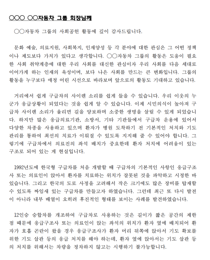 이어 “사람들에게 구급차 바꿔야한다고 주장하면 우리나라 비용 등이 실정에 안 맞는다고 반박합니다. 그런데 그렇지 않습니다. 사람 죽는 게 우리 실정에 안 맞아요? 그게 돈이 더 많이 듭니다. 이 문제는 우리가 살아가면서 꼭 고쳐야만 하는 일이에요. 이건 옳은 일이에요. 태어나서 죽을 때까지 아름다운 일을 할 기회가 별로 없는데 이건 진짜 아름다운 일입니다. 나를 위한 게 아니라 환자를 위한 일입니다”