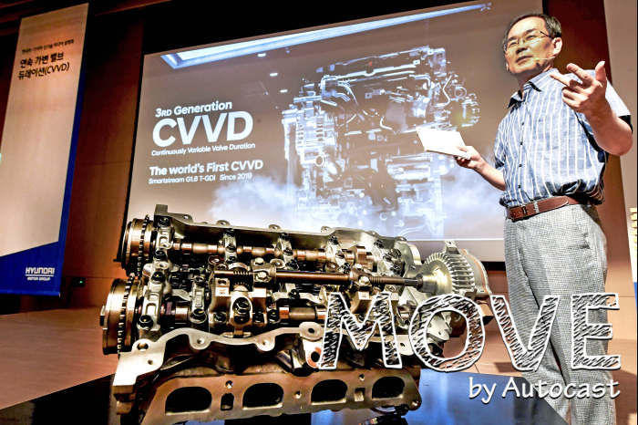 이날 엔진 신기술 설명을 맡은 현대차 하경표 연구위원은 "CVVD는 엔진 밸브를 열고 싶을 때 열고, 닫고 싶을 때 닫을 수 있는 기구를 고안하자는 아이디어에서 시작했다"며 "많은 제조사들이 가변 밸브 제어 기술을 개발하고 있지만 CVVD를 쉽게 구현하진 못했다. 이번에 현대차는 엔진 밸브 열림 시간 제어를 획기적으로 늘려주는 기술을 세계 최초로 개발, 엔진의 성능과 연비를 동시에 향상시켰다"고 말했다.