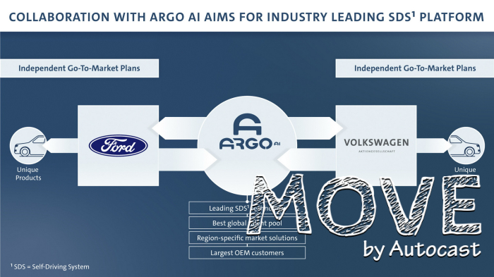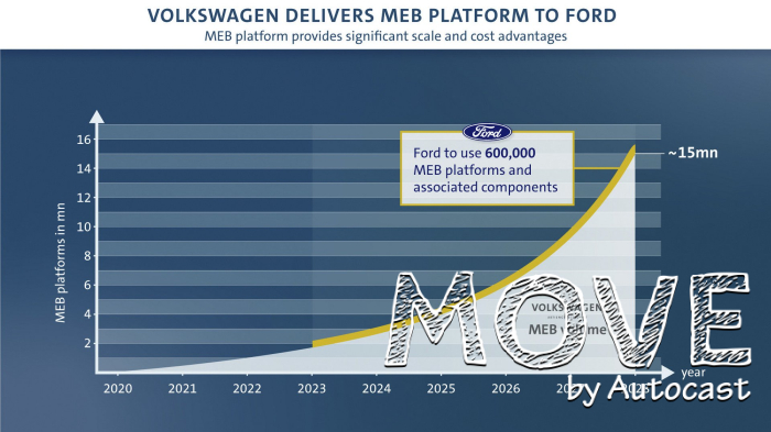 아르고 AI는 포드 자율주행차 LLC의 일부분이며, 폭스바겐은 증가하는 기술 개발 비용을 분담하는 것을 고려했다. 대신 포드는 유럽, 미국 및 중국을 위한 대량 시장 EV를 생성하도록 설계된 EV 전용 플랫폼인 폭스바겐의 MEB 아키텍처를 이용할 수 있게 된다. 폭스바겐은 MEB가 현재 ICE 구동 차량의 대부분을 지원하는 MQB 아키텍처보다 훨씬 확장성이 뛰어나다고 말한다.
