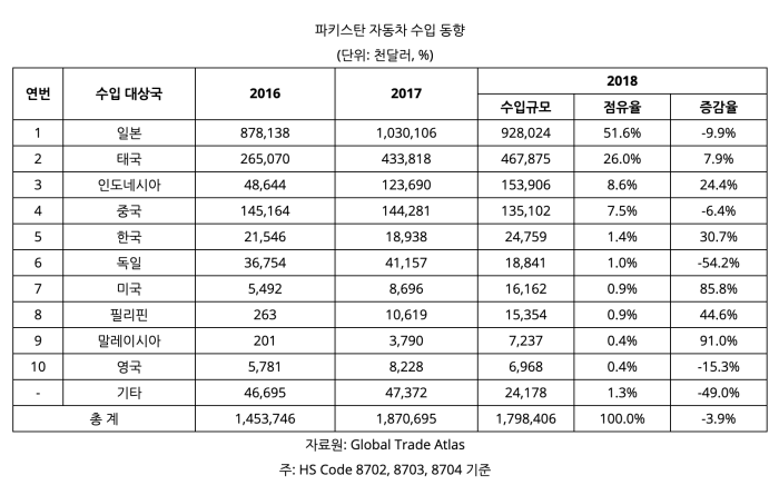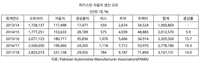 파키스탄은 2016년 자동차 산업 육성정책을 펼치며 신규 브랜드의 현지 투자가 활발하게 진행되고 있다. 현재는 지난 5월을 기준으로 판매량의 97%가 스즈키, 토요타, 혼다 등 일본 3사의 차량이며 지난 7월에는 기아자동차가 카라치에서 스포티지 모델의 양산을 시작했다.