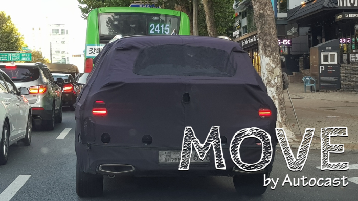 [오토캐스트=이다일 기자] 다음 달 출시를 앞둔 제네시스의 SUV GV80이 점차 위장막을 벗고 있다. 25일 오전 서울 시내에서 목격한 모습은 차체에 얼룩무늬 패턴이 사라지고 주요 부분의 두터운 위장막만 장착하고 도로를 달렸다. 앞, 뒤의 뚜렷한 라이트 디자인과 라디에이터그릴 모습으로 제네시스 GV80임을 한 눈에 확인할 수 있다.