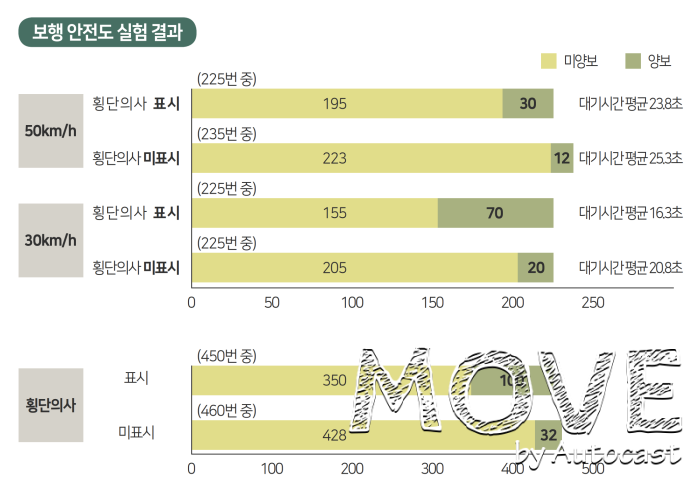 특히 신호가 없는 횡단보도에서 통행우선권에 대해서는 운전자의 인식과 운전습관에 괴리가 있는 것으로 나타났다. 운전자의 81.6%는 신호가 없는 횡단보도에서 멈추고 양보하겠다고 답했다. 하지만 실제 신호가 없는 횡단보도에서 의사를 표시하고 450회 횡단을 시도했을 때 운전자가 정차한 경우는 22.2%(100회)에 불과했다. 의사를 표시하지 않을 경우에는 460번 중 32회만 운전자가 정차했다.