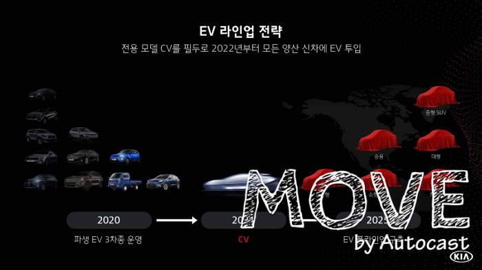 기아차는 2021년 첫 번째 전기차 전용 모델 출시를 시작으로 2022년부터 승용, SUV, MPV 등 전차급에 걸쳐 신규 전기차 모델을 투입한다. 또한, 궁극적으로 2025년까지 총 11종의 전기차 풀 라인업을 구축할 계획이라고 밝혔다. 이를 통해 글로벌 전기차 점유율 6.6%, 친환경차 판매 비중 25%를 달성한다는 목표다.