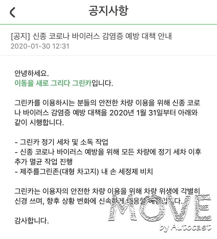 그린카 김상원 대표이사는 “신종 코로나 바이러스 확산 여파로 공유 모빌리티 이용에 불안감을 호소하는 고객을 위해 내부적으로 감염 예방 대책을 마련하고 엄격하게 시행할 예정”이라며 “공유 차량 이용자의 안전한 이동을 위해 상황 변화에 따른 신속한 지침 마련 및 대응을 준비하겠다”고 말했다.