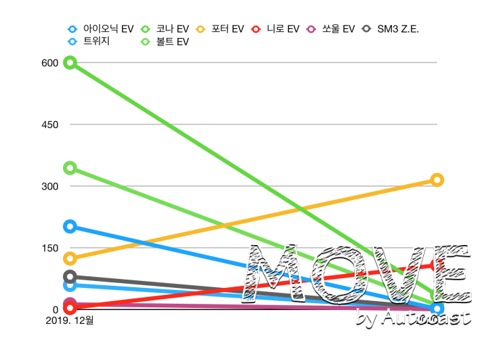 국산 자동차 회사가 2월 초 발표한 판매량 자료에 따르면 대부분의 전기승용차는 전월 대비 90% 이상 감소해 한 자릿수 내외를 기록했다. 반면, 현대자동차의 포터 EV는 총 315대를 판매했다.