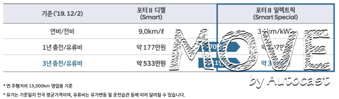 포터 EV의 높은 경제성도 판매에 긍정적인 영향을 미쳤다. 포터2 일렉트릭은 58.8kWh의 배터리를 탑재해 완전 충전 시 최대 211km를 주행할 수 있다. 이를 통해 연 주행거리 15000km 기준 충전비는 약 107만원으로 디젤 모델의 유류비 177만원에 비해 연간 약 70만원을 절약할 수 있다.