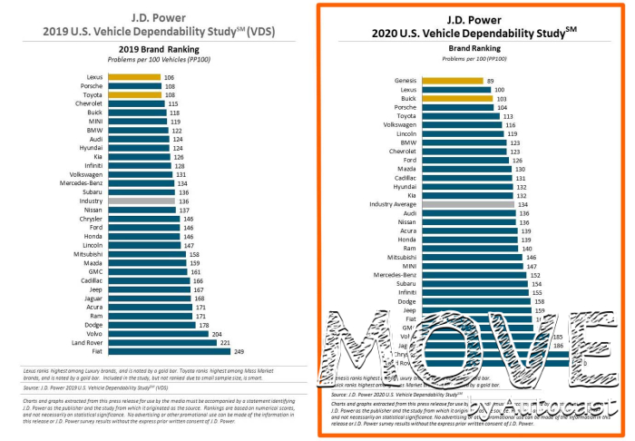 한편, 제네시스는 이번 조사에서 렉서스를 앞질렀지만 판매 대수에서는 큰 차이를 보였다. 제네시스는 2019년 미국 시장에서 차량 총 2만1,233대를 판매했다. 렉서스는 2019년 미국 시장에서 총 29만8,114대를 판매해 제네시스에 비해 14배 이상의 판매량을 기록했다.