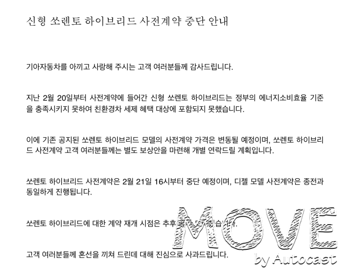 기아차는 이날 오후 홈페이지의 긴급 안내문을 통해 사전계약 중단 사실을 알렸다. 안내문에는 신형 쏘렌토 하이브리드가 정부의 에너지 소비효율 기준을 충족시키지 못해 친환경차 세제 혜택 대상에 포함되지 못했다고 밝히고 있다.