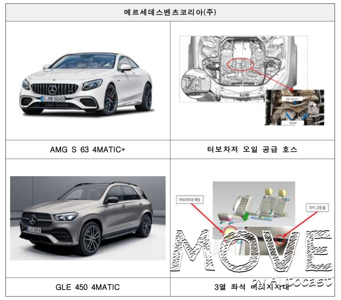 아직 판매되지 않은 GLE 400 d 4MATIC 등 2개 차종 4대는 3열 좌석 머리지지대의 조정과 고정이 제대로 되지 않아 탑승자에게 상해를 입힐 가능성이 나타났다. 아울러 AMG GT 63 4MATIC+ 등 2개 차종 2대는 자동변속기 배선을 고정하는 클립의 장착 위치 불량으로 변속기가 작동되지 않을 가능성이 나타나 리콜 대상에 포함됐다.