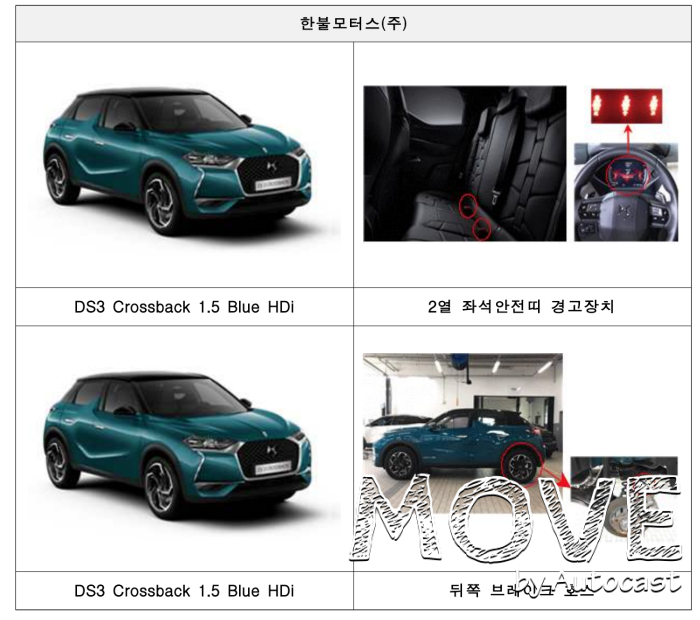 이 밖에 DS3 Crossback 1.5 Blue HDi 7대는 뒤쪽 브레이크 호스의 고정 불량으로 안전운행에 지장을 줄 가능성이 확인됐다. DS3 Crossback 1.5 Blue HDi 29대(미판매)는 상·하 부품이 제대로 접착되지 않은 냉각수 저장탱크가 장착돼 엔진이 과열될 가능성이 발견돼 리콜에 들어간다. 해당 차량은 오는 3일부터 무상 수리를 진행할 예정이다.
