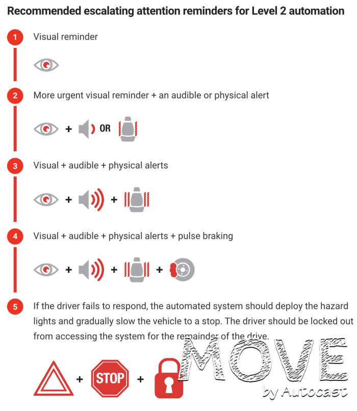 이에 IIHS는 이번 권고안을 통해 운전자의 시선과 머리 방향, 핸들 접촉, 차선 이탈 빈도 등 운전자 이탈을 직간접적으로 모니터링하고 감지할 수 있는 장치의 필요성을 주장했다. 또 주행 조건이 안전하지 않은 경우나 도로상에서 자율주행 모드 사용을 억제할 수 있는 장치의 필요성도 언급했다.