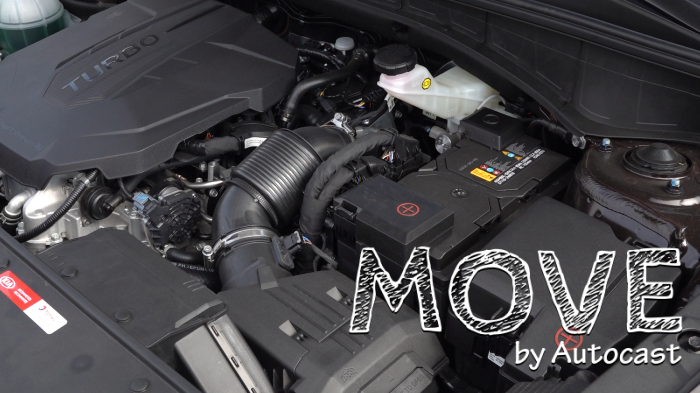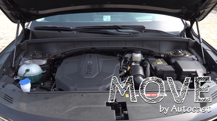 시승의 기점에 도착해 잠시 차에서 내렸다. 외부에서 들여다본 엔진룸은 여유롭고 시원하게 뚫려있다. 엔진 아래로 땅이 보인다. 그 사이로 타이로드와 스티어링 샤프트까지 보인다. 하이브리드 파워트레인을 얹을 공간인데 2.2리터 디젤 엔진이 들어갔으니 여유가 있는 것으로 추정된다.