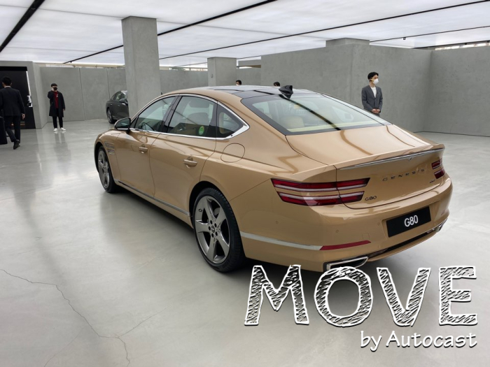 디자인은 제네시스 SUV GV80와 마찬가지로 대형 크레스트 그릴과 두 줄 디자인의 쿼드램프를 적용했다. 또 쿠페와 같이 매끄럽게 떨어지는 루프라인을 적용하고 전면부 쿼드램프에서 도어 상단부를 거쳐 후면부로 갈수록 점점 낮게 이어지는 ‘파라볼릭 라인(Parabolic Line)’을 적용했다. 후면부 역시 쿼드램프를 적용하고, 트렁크 표면은 말굽 형태로 둥글게 음각 처리했다.