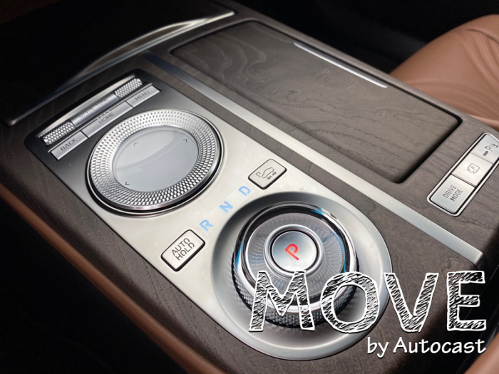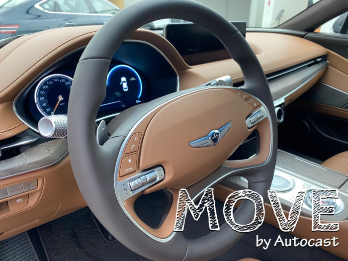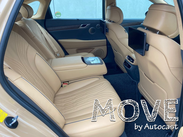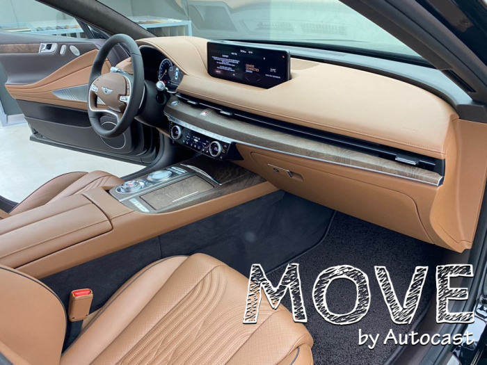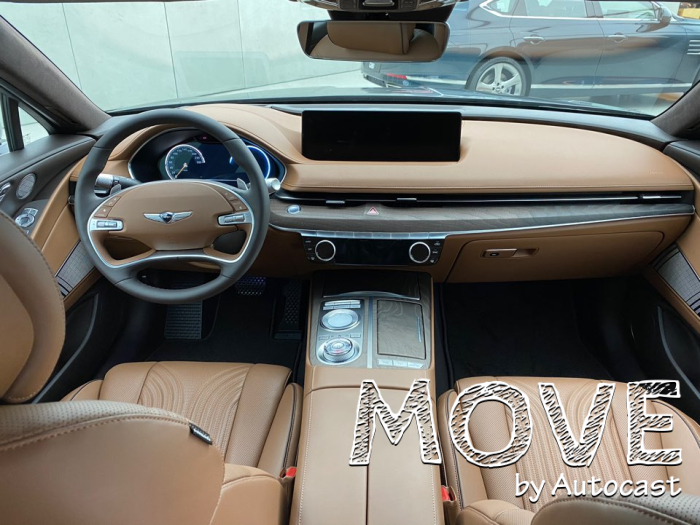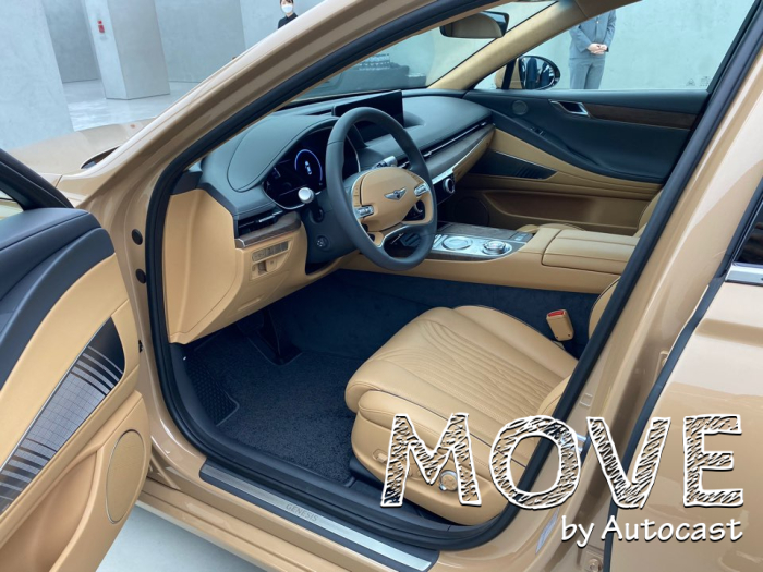 실내 크래쉬패드(계기판, 수납구 등이 포함된 부분)에는 양쪽 문과 접하는 부분까지 길게 이어진 날렵한 형태의 송풍구를 적용했다. 또 가로로 넓은 14.5인치 디스플레이를 배치했다. 센터콘솔에는 회전 조작 방식의 원형 전자식 변속기와 터치 및 필기 방식으로 인포테인먼트 시스템을 조작할 수 있는 제네시스 통합 컨트롤러(필기인식 조작계)를 적용했다.