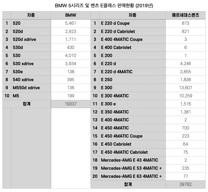 5시리즈와 E클래스 모두 변경 수준이 비슷한 데다가 출시일도 올 하반기로 예정돼 있어 두 모델의 경쟁은 더욱 치열해질 것으로 보인다. 과거 BMW는 벤츠와의 경쟁에서 1위를 이어오다 지난 2016년 처음으로 1위 자리를 내줬다. 이후 화재 이슈 등으로 판매 감소를 겪다가 최근 신차를 줄줄이 내놓으면서 격차를 대폭 줄였다. 반면 벤츠는 최근 배출가스 조작 논란이 변수로 작용하면서 두 모델의 경쟁 구도가 어떻게 흘러갈지 관심이 쏠리고 있다. 지난 한해 국내 시장에서 5시리즈와 E클래스는 각각 19,337대, 39,782대를 팔았다. 페이스리프트 출시를 앞둔 올해는 지난달 기준으로 각각 6278대, 7837대를 팔며 격차가 줄어든 상태다.