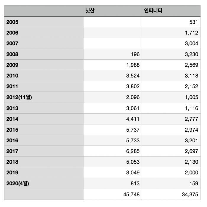 인피니티는 한국 시장에서 지난 2005년 판매를 시작해 올해 4월까지 누적 3만4375대를 팔았고, 닛산은 2008년 판매를 시작해 누적 4만5748대를 기록했다.