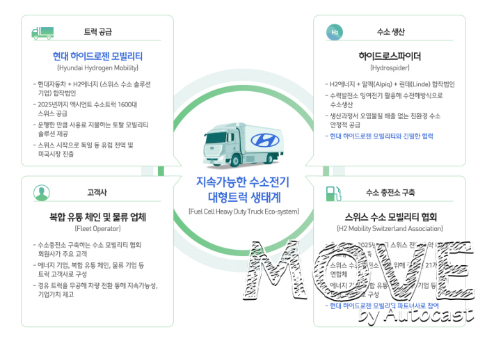 먼저 수소전기트럭 공급사인 현대 하이드로젠 모빌리티는 지난해 스위스 내 수소충전소 구축을 목적으로 총 21개의 글로벌 에너지사와 물류기업이 연합해 설립한 『스위스 수소 모빌리티 협회(H2 Mobility Switzerland Association)』에 파트너사로 참여하면서 수소 충전 부문과 전략적 협력관계를 맺었다.