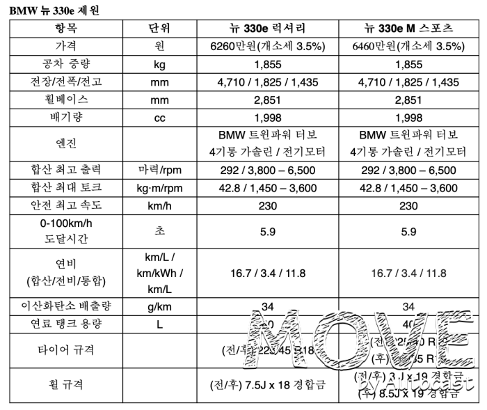 뉴 330e의 럭셔리 트림은 6260만원, M스포츠 트림은 6460만원이며 개별소비세 3.5%를 적용했다.