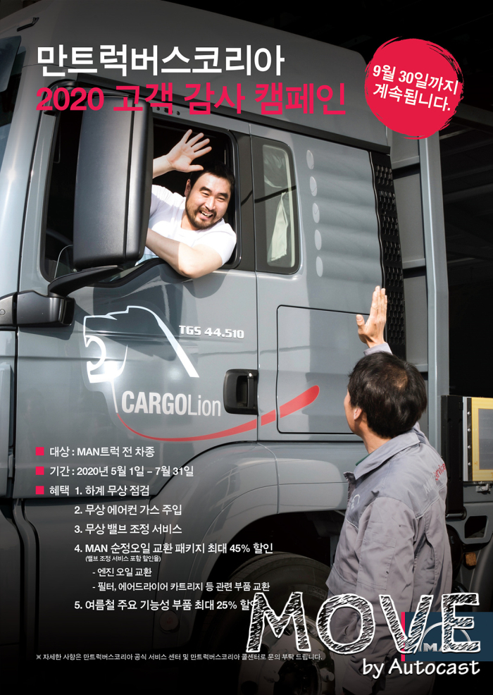 [오토캐스트=정영철 기자] 만트럭버스코리아가 4일 MAN 트럭 전체 고객을 대상으로 실시한 ‘2020년 고객 감사 캠페인’을 오는 9월 30일까지 2달 연장한다고 밝혔다.