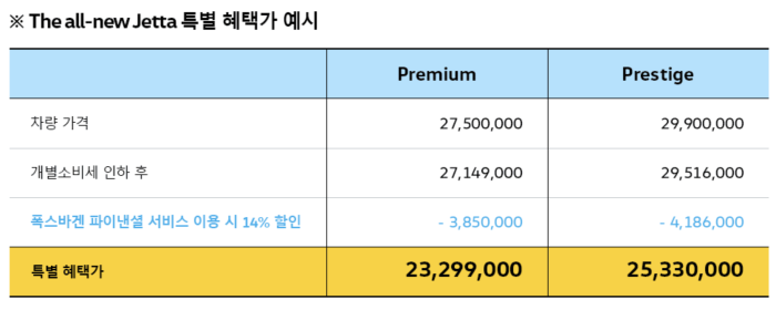 아울러 폭스바겐코리아는 제타 국내 출시를 기념해 2650대 한정으로 제타 론칭 에디션을 판매한다. 제타 론칭 에디션의 가격은 개소세 인하분 반영 시 프리미엄 모델 2714만9000원, 프레스티지 모델 2951만6000원이다. 폭스바겐파이낸셜서비스 프로그램을 이용하면 프리미엄 모델의 경우 최대 14%의 추가 할인을 받아 2329만9000원에 구매할 수 있다.