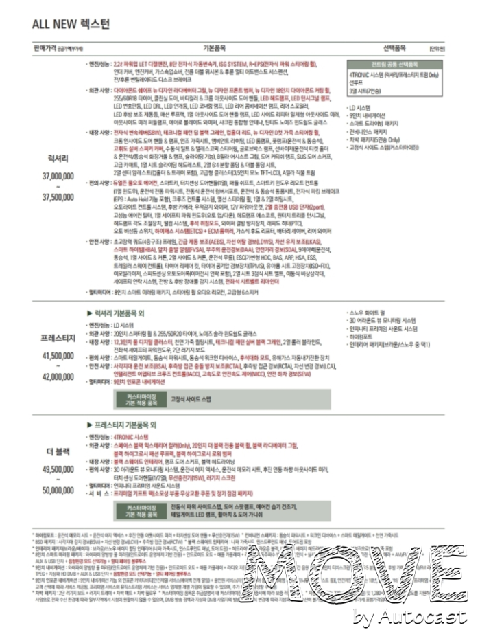 올 뉴 렉스턴의 기본 트림은 럭셔리다. 사전계약 가격 기준으로 3700만원~3750만원부터 시작한다. 2.2리터 LET 디젤 엔진과 8단 자동변속기 그리고 R타입의 전자식 파워스티어링휠은 모든 트림에 기본이다. 또, 전자식 변속레버, D컷 가죽스티어링휠도 들어간다.