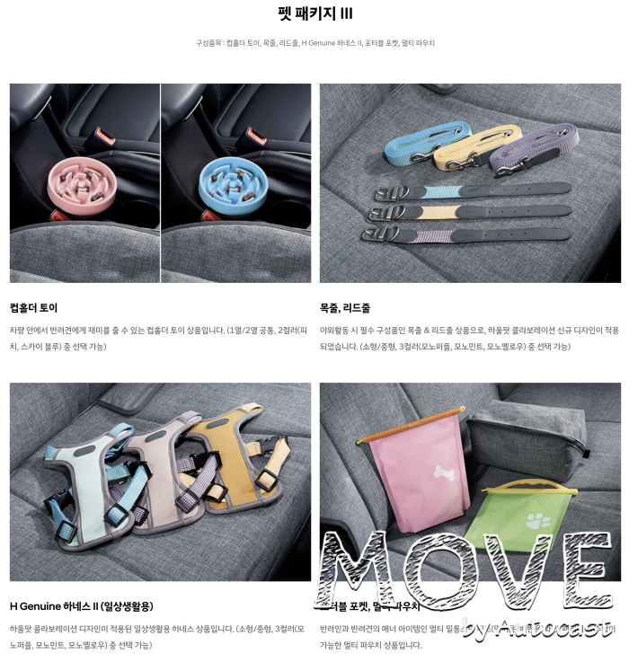 반려동물용 커스터마이징 패키지도 추가했다. 야외 활동에 필요한 컵홀더 토이(1/2열 공용), 목줄과 리드줄, 포터블 포켓과 멀티파우치, 일상 생활용 하네스로 이루어진 ‘펫 패키지3’를 신규 추가했다.