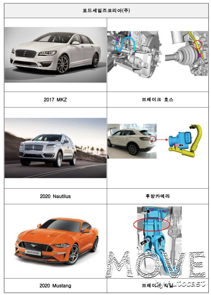 포드 MKZ 등 4개 차종 1만2172대는 앞바퀴 브레이크 호스의 내구성 부족으로 브레이크액이 누유돼 제동 시 제동거리가 길어질 가능성이 발견됐다. 머스탱 808대는 브레이크 페달 부품 내구성 부족으로 페달에 강한 힘을 전달 시 부품이 파손돼 제동력을 상실할 가능성이 확인됐다.