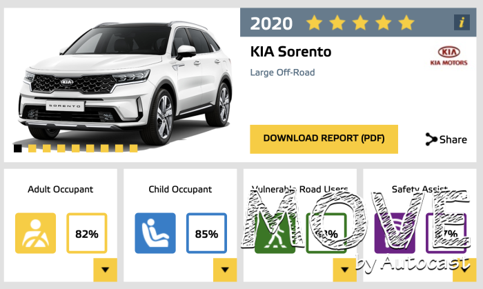 쏘렌토는 ▲성인 탑승자 보호 ▲어린이 탑승자 보호 ▲보행자 보호 ▲안전 보조 시스템 등 네 가지 평가 부문의 종합 평가 결과 최고 등급을 달성했다.