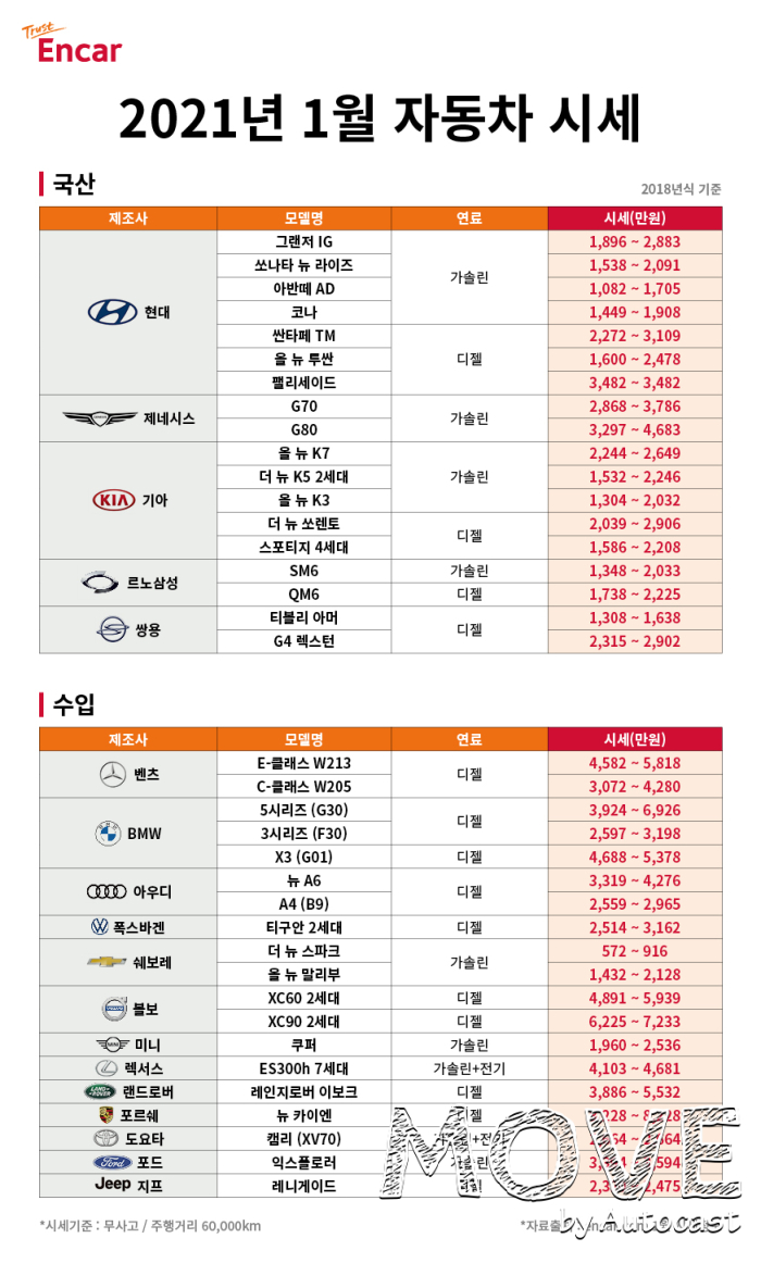 엔카닷컴은 현대차, 기아차, 르노삼성, 쌍용등 국내 완성차 브랜드와 벤츠, BMW 등 수입차 브랜드의 2018년식 인기 차종의 중고차 시세를 공개했다. 해가 바뀌면 중고차 시세가 소폭 상승하던 예년과 달리 올해 1월은 국산 및 수입차 전반적으로 중고차 시세가 약 1% 하락했다. 특히 SUV 선호 현상이 잇따르면서 세단 모델의 하락세가 두드러졌다.
