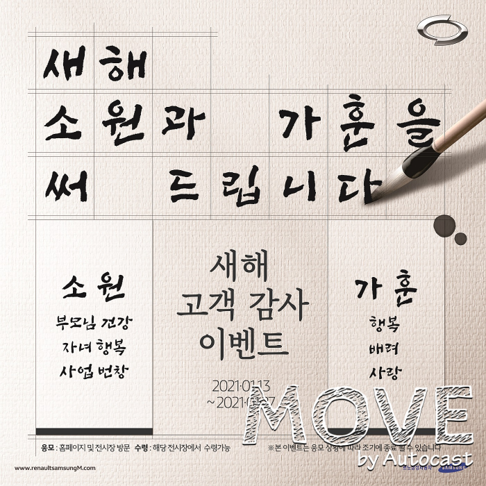 [오토캐스트=강명길기자] 르노삼성자동차가 새해를 맞아 27일까지 전시장 방문 고객을 대상으로 캘리그라피(서예)로 새해 소망문구나 가훈 작성 이벤트를 실시한다고 14일 밝혔다. 이번 이벤트는 코로나19로 지친 고객들을 위로하고자 마련됐다.