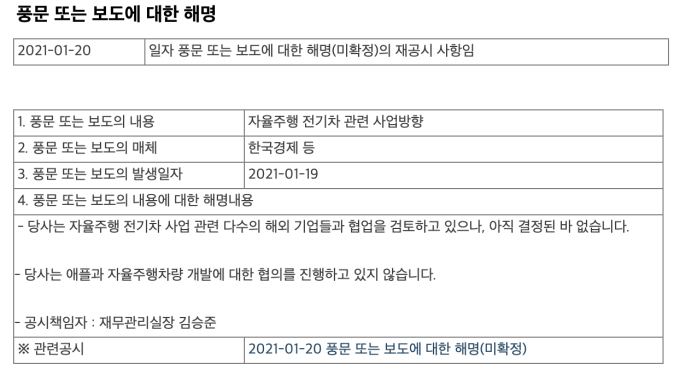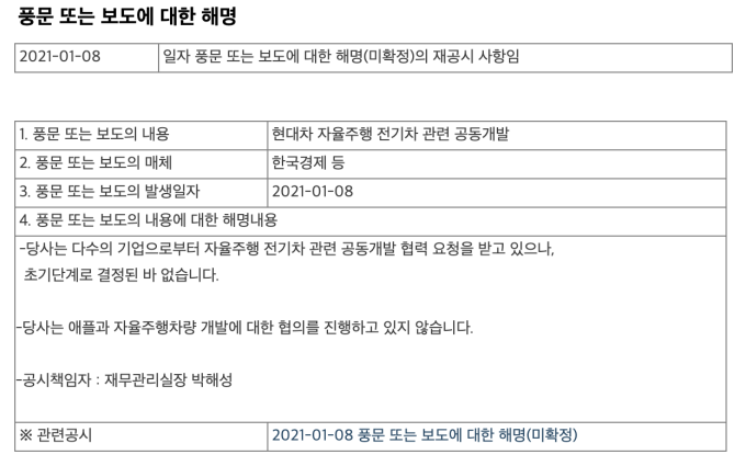 8일 현대・기아차는 각각 공시를 통해 “당사는 다수의 기업으로부터 자율주행 전기차 관련 공동개발 협력 요청을 받고 있으나 초기 단계로 결정된 바 없습니다”라고 밝혔다. 특히 “당사는 애플과 자율주행차량 개발에 대한 협의를 진행하고 있지 않습니다”라고 설명했다.
