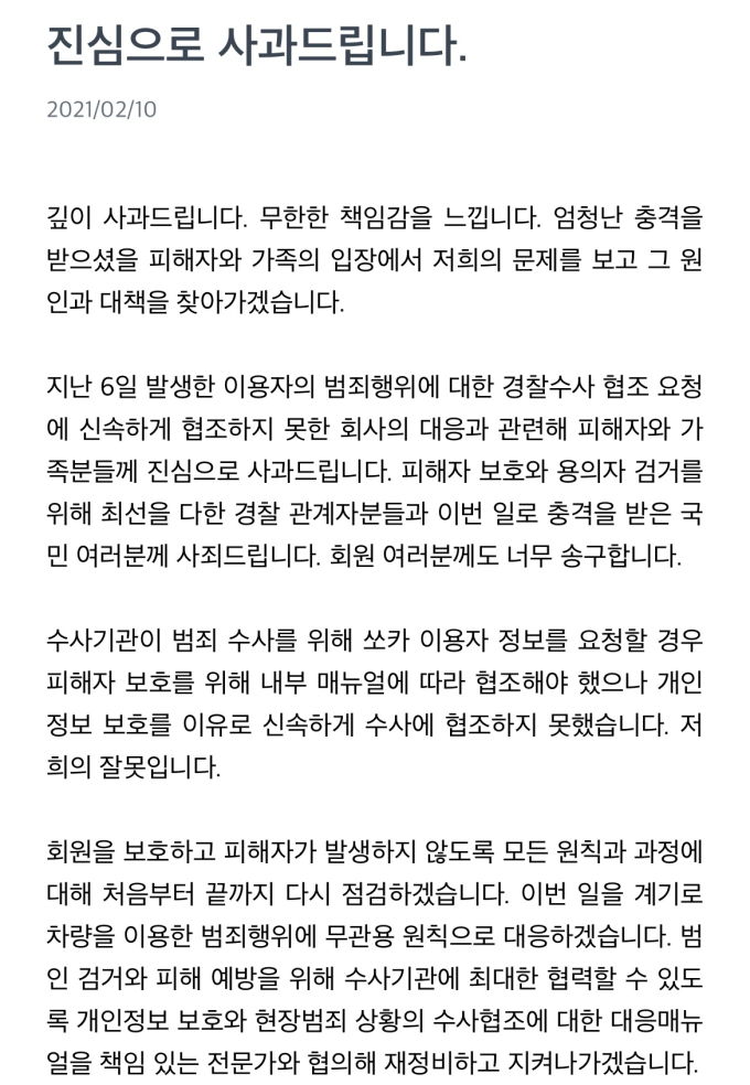 이 같은 부실 대응 논란에 쏘카 박재욱 대표는 이날 오전 사과문을 통해 “지난 6일 발생한 이용자의 범죄행위에 대한 경찰수사 협조 요청에 신속하게 협조하지 못한 회사의 대응과 관련해 피해자와 가족분들께 진심으로 사과드린다”고 밝혔다.