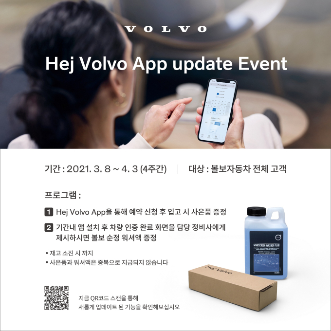한편 이번 업데이트를 기념해 4월 3일까지 전국 서비스센터에서는 ‘헤이, 볼보’ 앱을 통해 예약을 신청한 고객을 대상으로 친환경 고체치약과 나무칫솔 세트를 증정하는 사은품 이벤트를 실시한다. 또한 해당 기간 중 신규로 앱을 설치한 후 차량 인증까지 완료한 고객에게는 순정 워셔액을 증정한다.